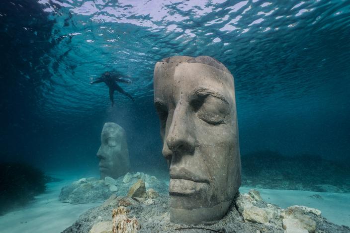 Jason deCaires Taylor設計的作品,位於坎城的聖瑪格莉特島,號稱為歐洲第一個水下環境保育博物館,使用環保材質打造六座象徵坎城的巨石頭像,期盼能變成一個水下生物棲息地,提升水下生態系統,也同時對來參觀的遊客推廣環境教育。離岸邊約150公尺,水深3-5米處,雕像高2米,重10公噸,是不是很有震撼力? 傳聞在1687年至1698年鐵面人被關在聖瑪格莉特島上的監獄,也因此選了面具頭像作為博物館的主題。